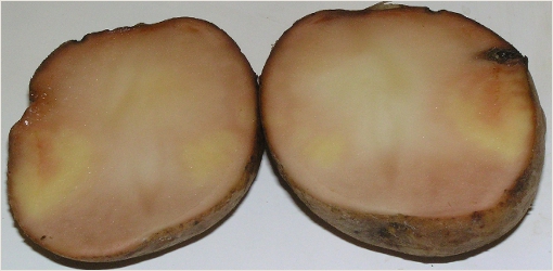 При -1°…0°С происходит переохлаждение клубней: поверхность клубня становится мягкой, но не вялой, кожура темнеет, глазки и чечевички отмирают, клубни становятся влажными. На разрезе клубня видна иссушенная мякоть с небольшими трещинами, точками, пятнами и полостями ржаво-бурого цвета.